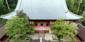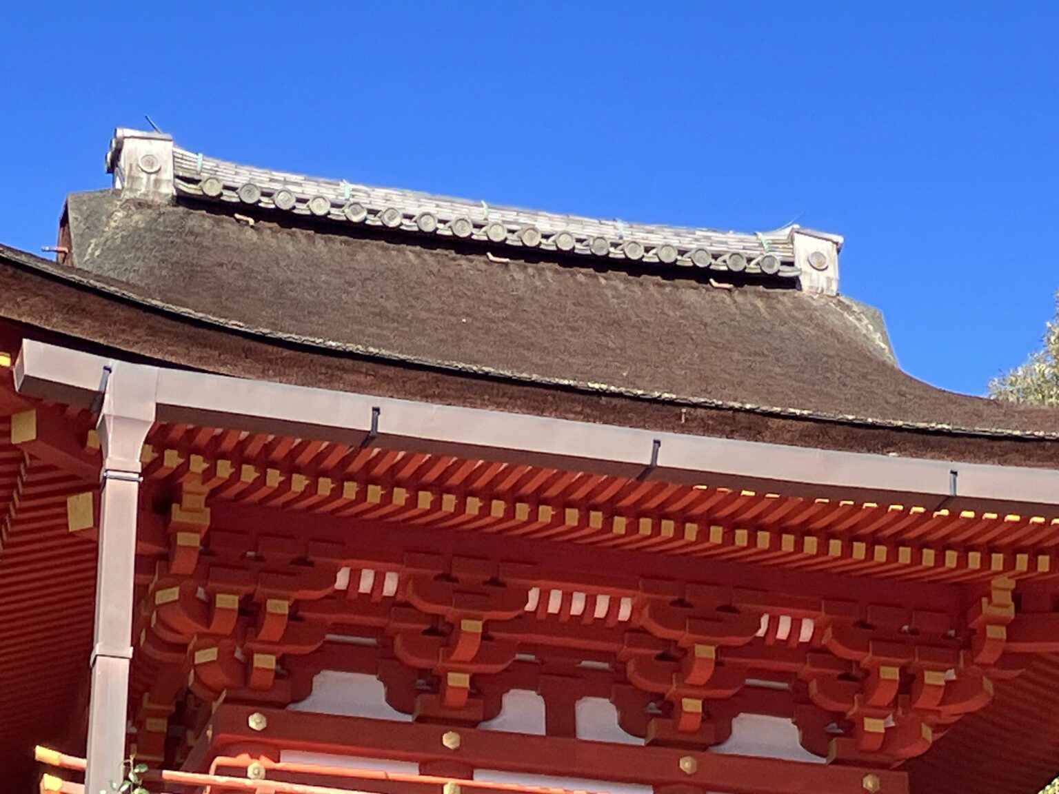 房の上で金色の仏が烏帽子をかぶり、風で飛ばぬように紙捻(こより)であごにつけ、檜皮を葺いています。驚かずにはいられませんでした。