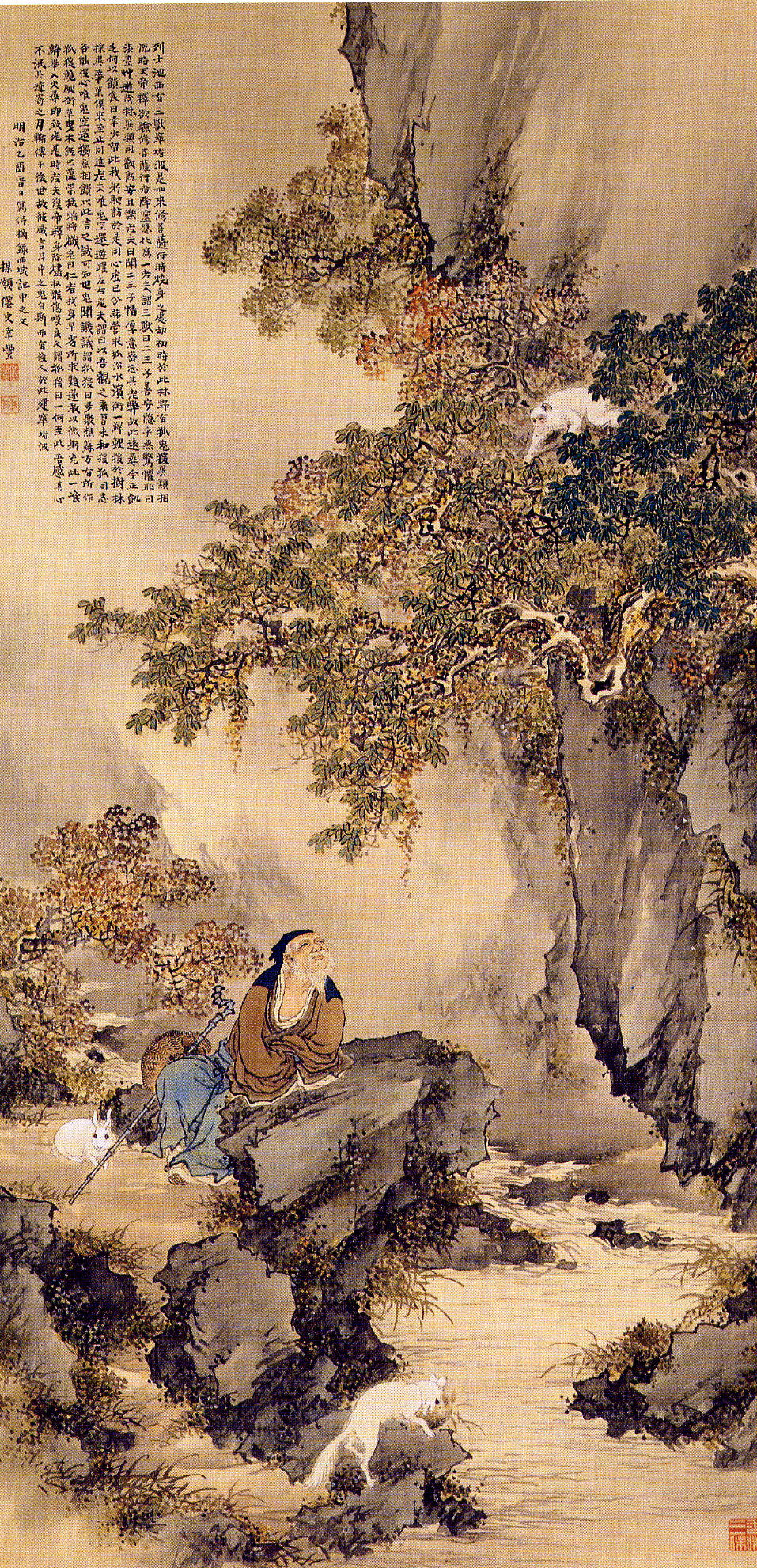 家の妻子や使用人は(急に気前がよくなった主人を見て)「おかしなこともあるものだ」と思いました。そのとき、ほんものの盧至が帰ってきて門をたたきました。見てみると、家にいる盧至とまったく同じすがたの人がいます。